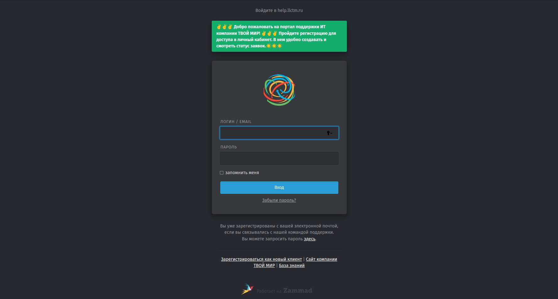 1. Первым шагом заходим на сам портал https://help.llctm.ru и нажимаем кнопку "Зарегистрироваться как новый клиент" внизу экрана.