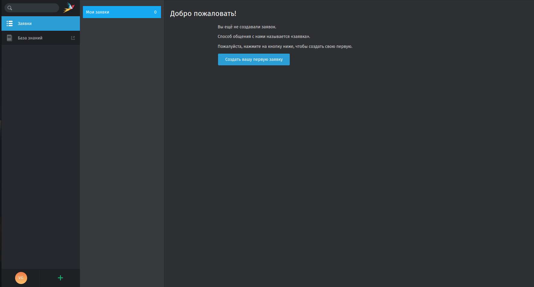 1. Зайдите в личный кабинет на портале помощи. Сразу же вы увидите раздел "Заявки". И в нем кнопку "Создать вашу первую заявку". Нажмите на неё.