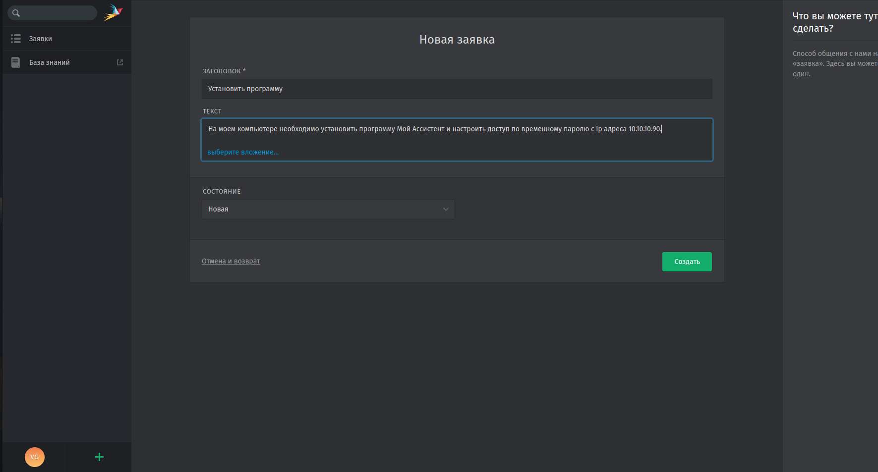 2. Перед вами откроется форма создания заявки. В поле "Заголовок" укажите краткое описание задачи, в поле "Текст" опишите более детально задачу. Если необходимо добавьте вложение (скриншот, документ, видео). Нажмите кнопку "Создать" и первая ваша заявка будет создана.