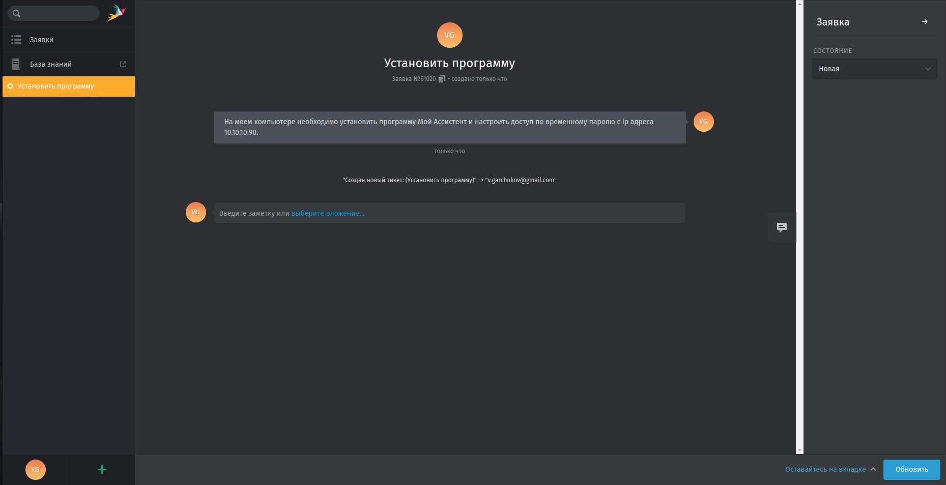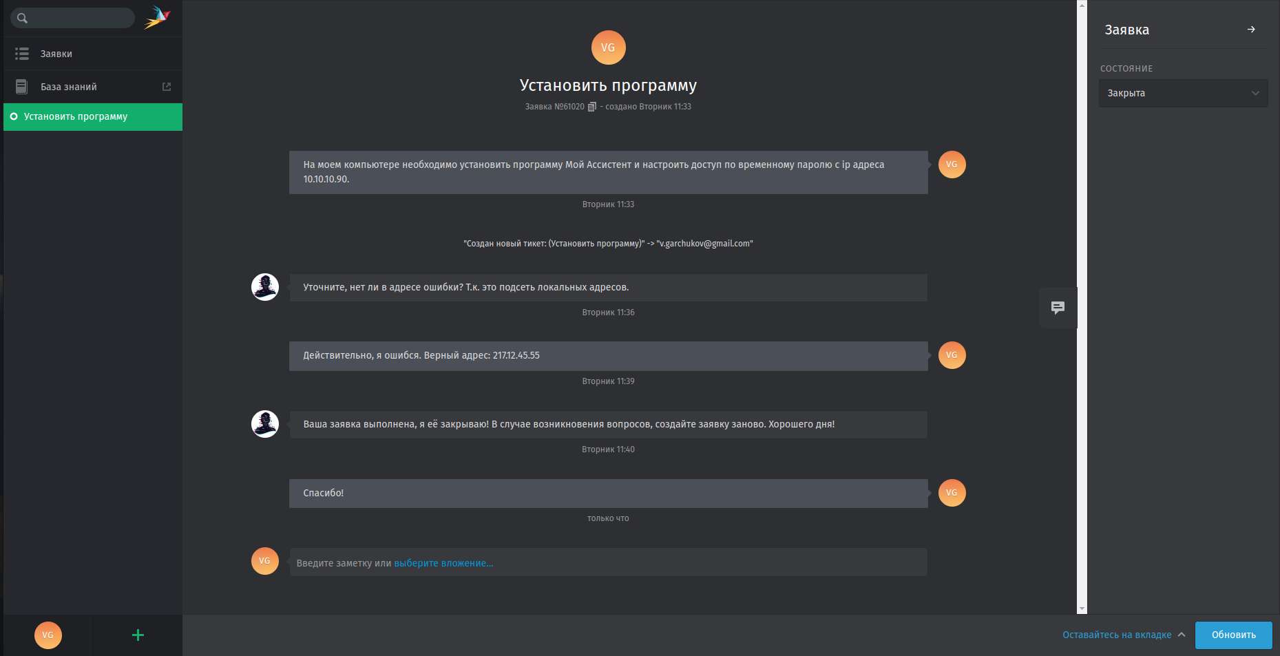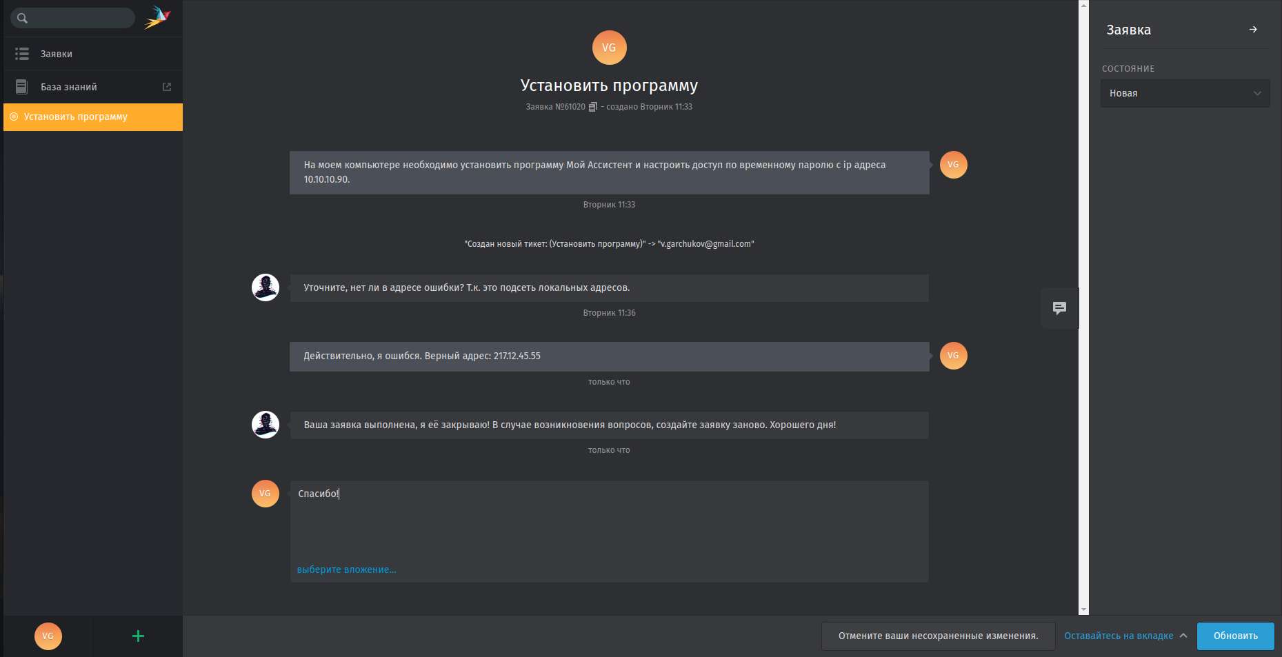4. Так же на экране заявки вы можете написать уточняющую информацию. Специалисты технической поддержки так же могут задать вам уточняющий вопрос на странице заявки. Т.е. в самой заявке существует полноценный чат.